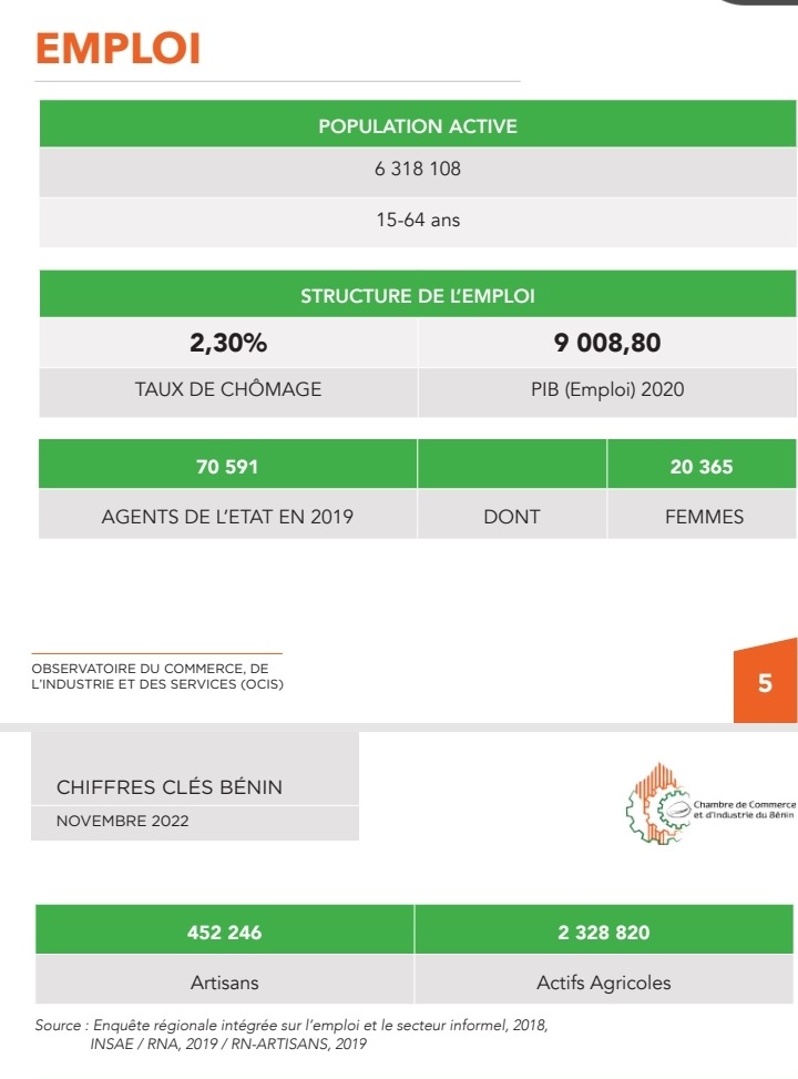 En parallèle, les données issues du site de la Chambre de Commerce et d’Industrie du Bénin (CCIB), à fin décembre 2021, indiquent que la population active (15-64 ans) était de 6 318 108 personnes. Selon cette même source, le taux de chômage était de 2,3 %, soit 145 316 personnes. Même en considérant ces données, le chiffre de trois millions de jeunes dans l’agriculture semble largement surestimé ou mal interprété, à moins de confondre insertion nouvelle et présence historique dans ce secteur.