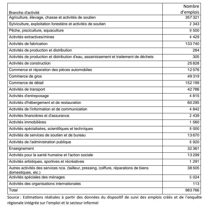 Ce que révèlent les données de l’INStaD, c’est surtout une prédominance écrasante de l’emploi informel : huit emplois sur dix sont non déclarés, peu ou pas protégés, souvent précaires et faiblement rémunérés. Les principales branches d’activité concernées sont :