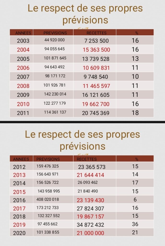 Évolution des prévisions budgétaires et recettes mobilisées par la commune de So-ava de 2003 à 2020